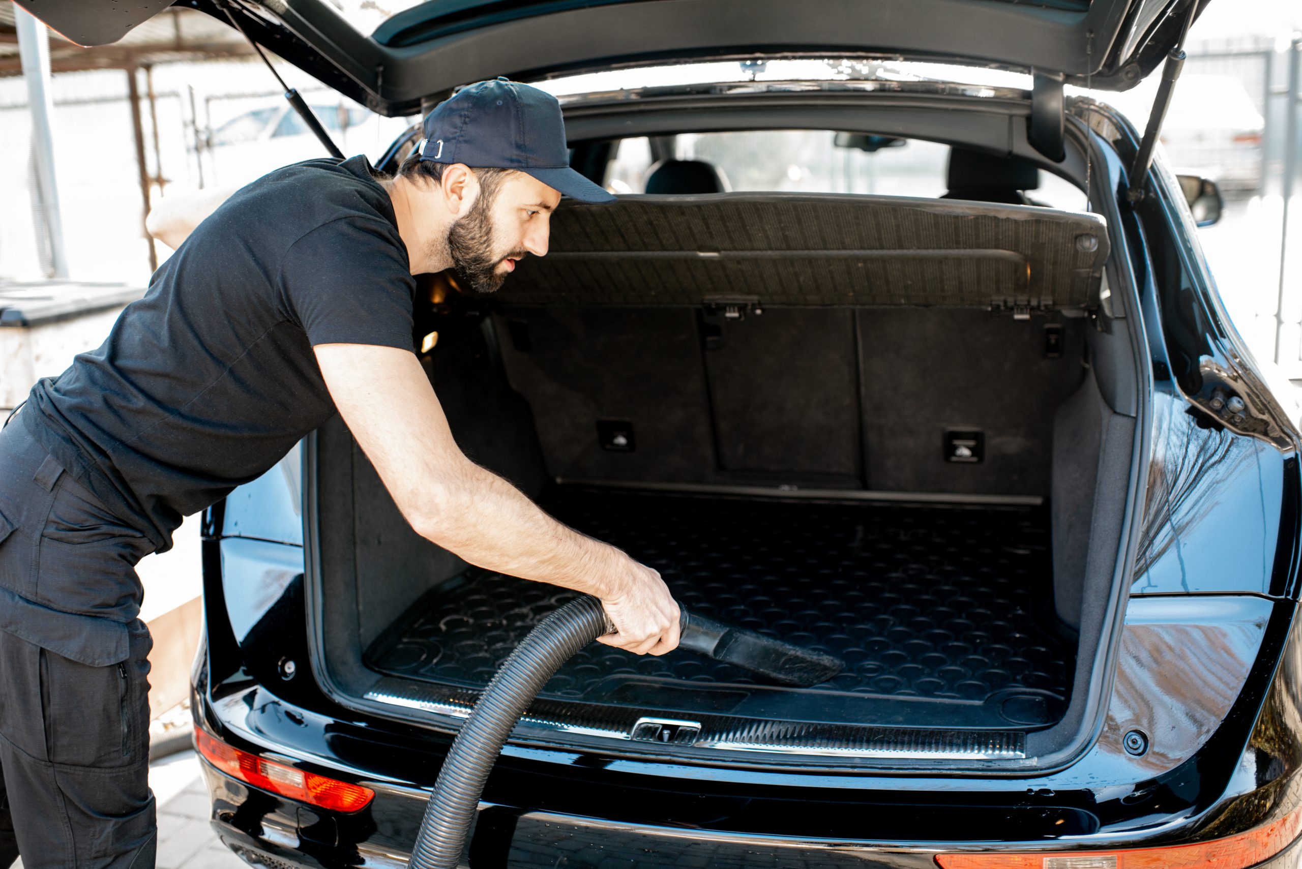 Cleaner vecuuming car trunk by Shadyside_Detail_1|Published January 26, 2023-at dimensions 2560 × 1709 Images navigation Previous Next Professional cleaner in black t-shirt and cap vacuuming trunk of a luxury big car outdoors